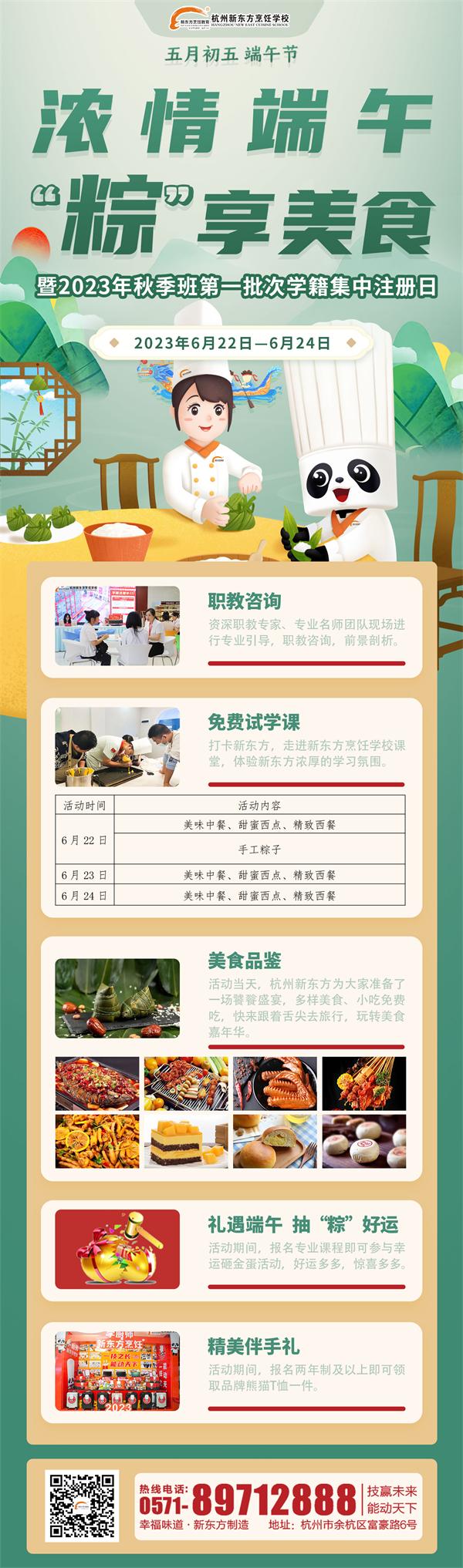 農(nóng)歷五月初五是中國的傳統(tǒng)節(jié)日——端午節(jié)。2000多年前遺留下來的習(xí)俗:掛菖蒲、賽龍舟、吃粽子、飲雄黃、佩香囊,讓大家充分感受到了這個(gè)節(jié)日所蘊(yùn)含的民族情懷。國家對節(jié)假日的調(diào)整是對這些民俗類的非物質(zhì)文化遺產(chǎn)保護(hù)的一種有效方式。值此佳節(jié),為了幫助更多有志青年實(shí)現(xiàn)自己的夢想,杭州新東方職業(yè)學(xué)校特開展“濃情端午·‘粽’享美食”暨2023年秋季班第一批次學(xué)籍集中注冊日活動(dòng),為廣大學(xué)子提供學(xué)習(xí)平臺,實(shí)現(xiàn)多彩夢想。
